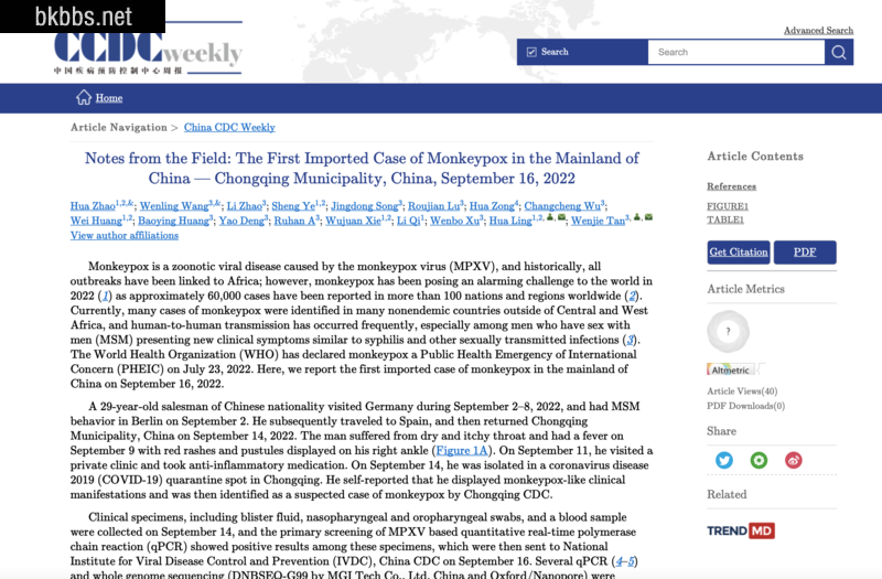 中国疾控中心周报今天发布了《现场纪要:中国内地首例输入性猴痘病例——中国重庆市,2020年9月16日》(以下简称“现场纪要”)。buC拜客生活常识网