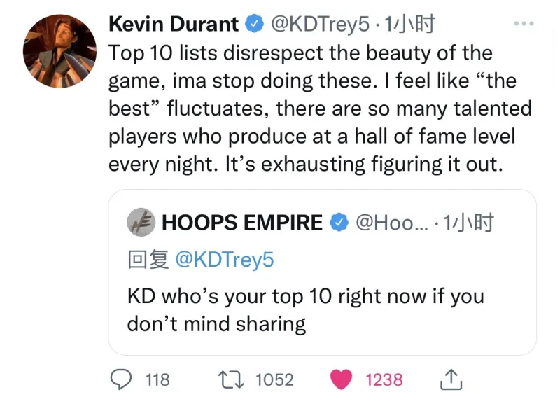 杜兰特:“前10榜单是对比赛美妙之处的不尊重,我会停止这么做。我觉得‘最佳’这个词有波动,每晚都有太多的球员打出名人堂级别的水准。制定这样一份榜单会很累人。”