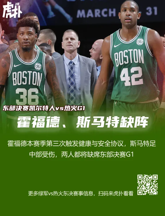 赛前,凯尔特人官方宣布:艾尔-霍福德触发健康与安全协议,马库斯-斯马特足中部扭伤,两人都将缺席今日比赛。