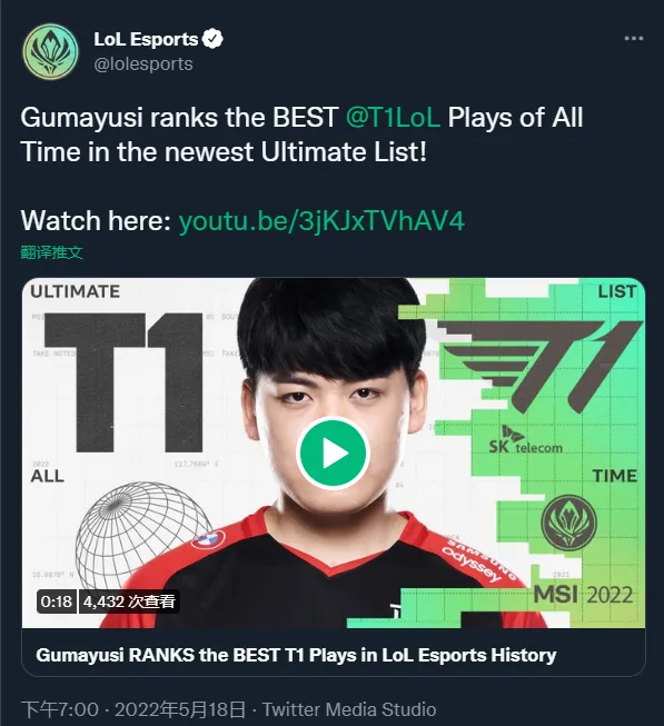 05月18日讯 LOL官推更新最新一期极限榜单,本期为T1现役AD选手Gumayusi评T1队史最佳操作并为其排名。以下顺序按照Gumayusi的排名从低到高排列。