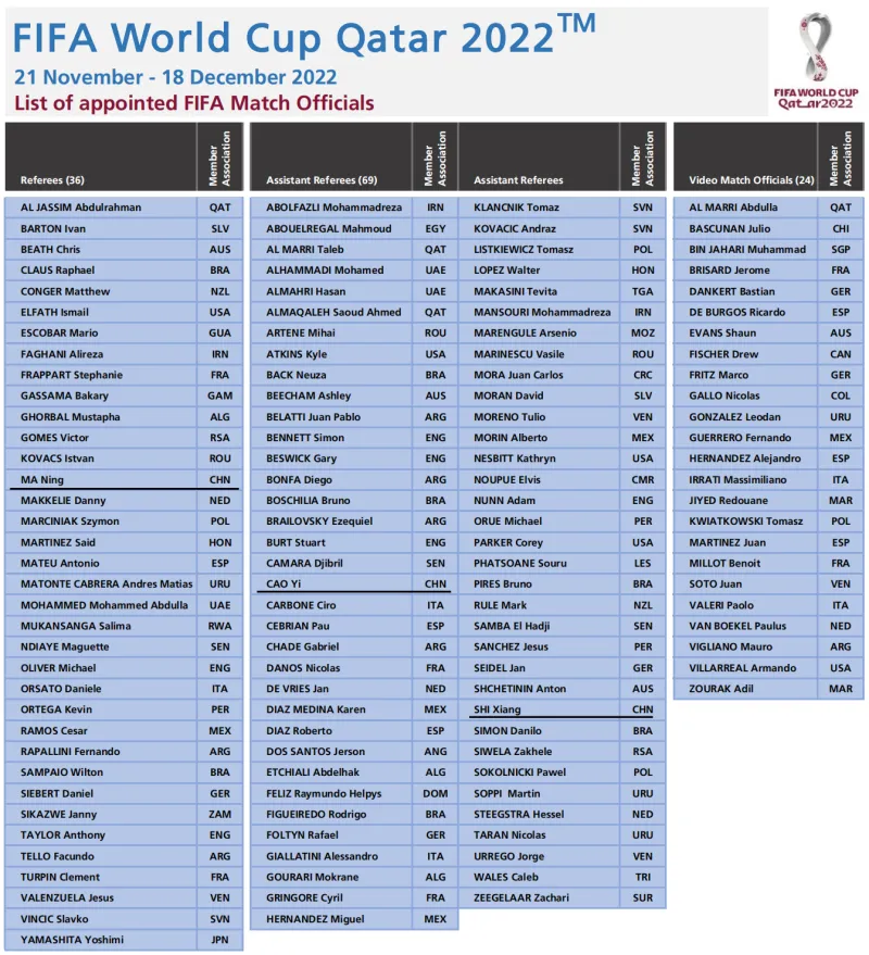 05月19日讯 国际足联官方公布了2022卡塔尔世界杯的裁判团队。来自中国足协的马宁将担任主裁判,曹奕、施翔任助理裁判。