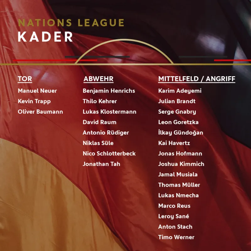 中前场:阿德耶米(萨尔茨堡红牛-多特蒙德)、布兰特(多特蒙德)、格纳布里(拜仁慕尼黑)、格雷茨卡(拜仁)、京多安(曼城)、哈弗茨(切尔西)、霍夫曼(门兴格拉德巴赫)、基米希(拜仁慕尼黑)、穆夏拉(拜仁慕尼黑)、穆勒(拜仁慕尼黑)、恩梅查(沃尔夫斯堡)、罗伊斯(多特蒙德)、萨内(拜仁慕尼黑)、斯塔赫(美因茨)、维尔纳(切尔西)