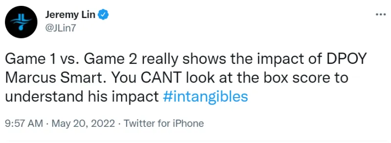 林书豪在推特上写道: “G1和G2的不同真的展示了最佳防守球员斯玛特的影响力,这种影响力不是通过数据能看出来的。”