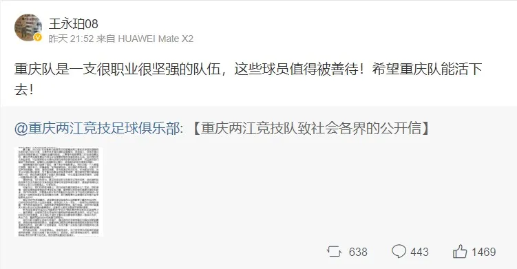 王永珀在微博中表示:“重庆队是一支很职业很坚强的队伍,这些球员值得被善待!希望重庆队能活下去!”