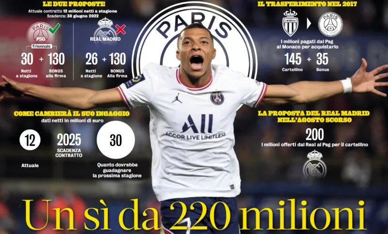 05月22日讯 根据《米兰体育报》驻巴黎跟队记者Alessandro Grandesso的报道,巴黎圣日耳曼为姆巴佩提供的薪水待遇为税后3000万欧元+1.3亿签字费,这份报价只是略微高于皇马开出的税后2600万欧元年薪+1.3亿签字费。