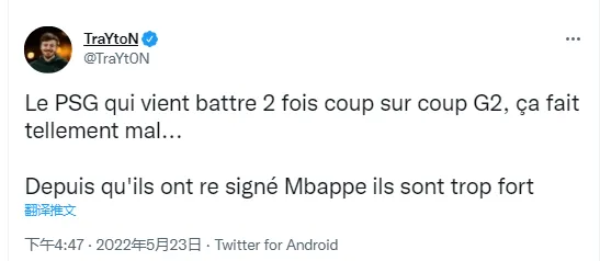 TraYtoN:PSG已经连续两次击败G2了,这太伤人了!自从他们重新签下姆巴佩以来,他们太强大了。