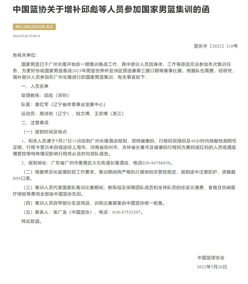 国家男篮已于广州长隆开始新一期集训备战工作,其中部分人员因身体、工作等原因无法参加本次集训任务,为更好协助国家男篮备战2023年男篮世界杯亚洲区预选赛第三窗口期等赛事比赛,根据队伍需要,经研究,增补部分人员参加在广州长隆进行的国家男篮集训,有关事宜如下: