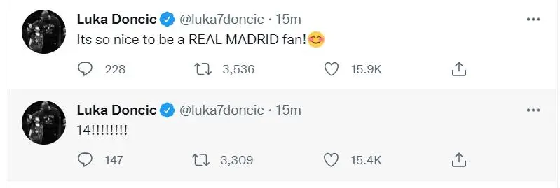 本场比赛结束之后,NBA球星东契奇在推特上发文,祝贺皇马夺冠。他先是发了一条“14!!!!”字样的推文,祝贺皇马夺得历史上第14座欧冠冠军奖杯,然后又发文写道:“成为皇马球迷真是太美好的一件事了!”