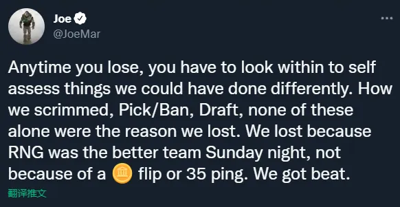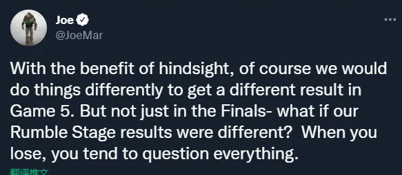 任何时候当你输掉比赛的时候,你都必须反省自身,我们本可以作出不同的选择,不论是训练、BP、游戏内的抉择、这些都不是你输掉比赛的借口。我们输掉MSI决赛是因为周日那天晚上RNG是更强的队伍,不是因为抛硬币或者35ping的延迟。输了就是输了