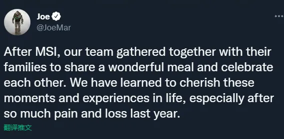 在MSI之后,我们会和家人们在一起团聚,享受美食,和家人一起庆祝。我们已经学会珍惜生活中的这些美好的记忆。尤其是在去年经历了如此多的痛苦和失利之后。
