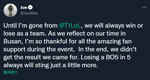 直到我离开T1之前,不论输赢我们一直都会团结一致。当我们回顾釜山之旅时,首先我想感谢粉丝们在比赛过程中对我们的支持。在最后,我们没能得到想要的结果。鏖战五局输掉BO5总是更痛的。