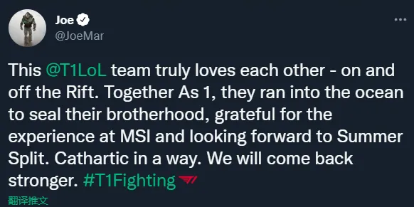 06月01日讯 T1现任CEO joe marsh在个人推特上发表一大段关于MSI之后的感想,具体如下: