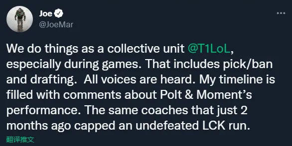 我们T1一直作为一个整体运行,尤其是在比赛期间。这包括BP以及决策等等。所有的意见我都看到了,在我的评论区里充满了对Polt和Moment表现的看法。然而就在两个月前,他们带领T1以不败战绩拿下LCK冠军。