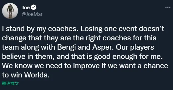 我支持教练团队。输掉一项赛事并不会改变他们和Bengi还有Asper一起是最适合这支队伍的教练这个事实。我们的选手信任他们,这对我而言就足够了。我们知道要想拿下S赛冠军我们需要提升。