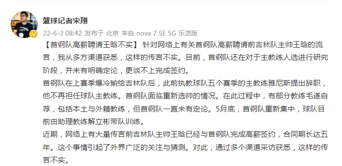 “针对网络上有关首钢队高薪聘请前吉林队主帅王晗的流言,我从多方渠道获悉,这样的传言不实。目前,首钢队还在对于主教练人选进行研究阶段,并未有明确定论,更谈不上完成签约。”宋翔在微博上写道。