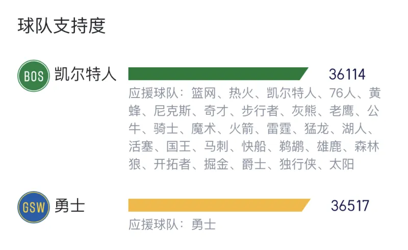 不过,支持勇士的总票数已经超过了支持凯尔特人的总票数,可以说是真正的1VS29!