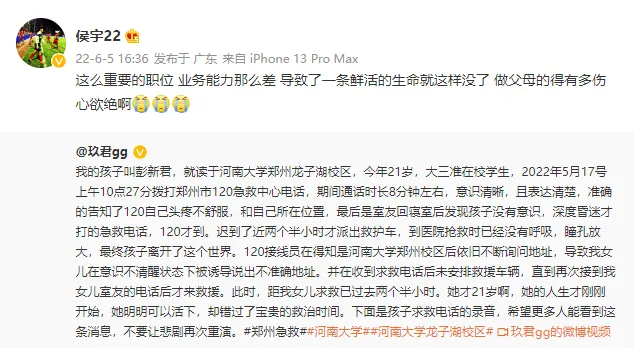 06月05日讯 近日,河南大学一女学生因为突发脑出血拨打急救电话,期间与接线员沟通近8分钟,2小时后才派出救护车,最终错过宝贵的救治时间,不幸去世。