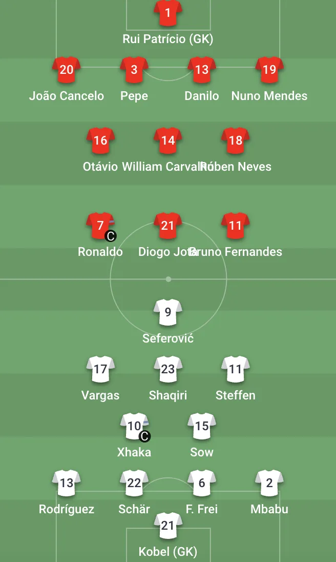 葡萄牙首发:1-帕特里西奥、20-坎塞洛、3-佩佩、13-达尼洛-佩雷拉、19-努诺-门德斯、14-威廉-卡瓦略、18-鲁本-内维斯、16-奥塔维奥、11-B费、21-若塔、7-C罗