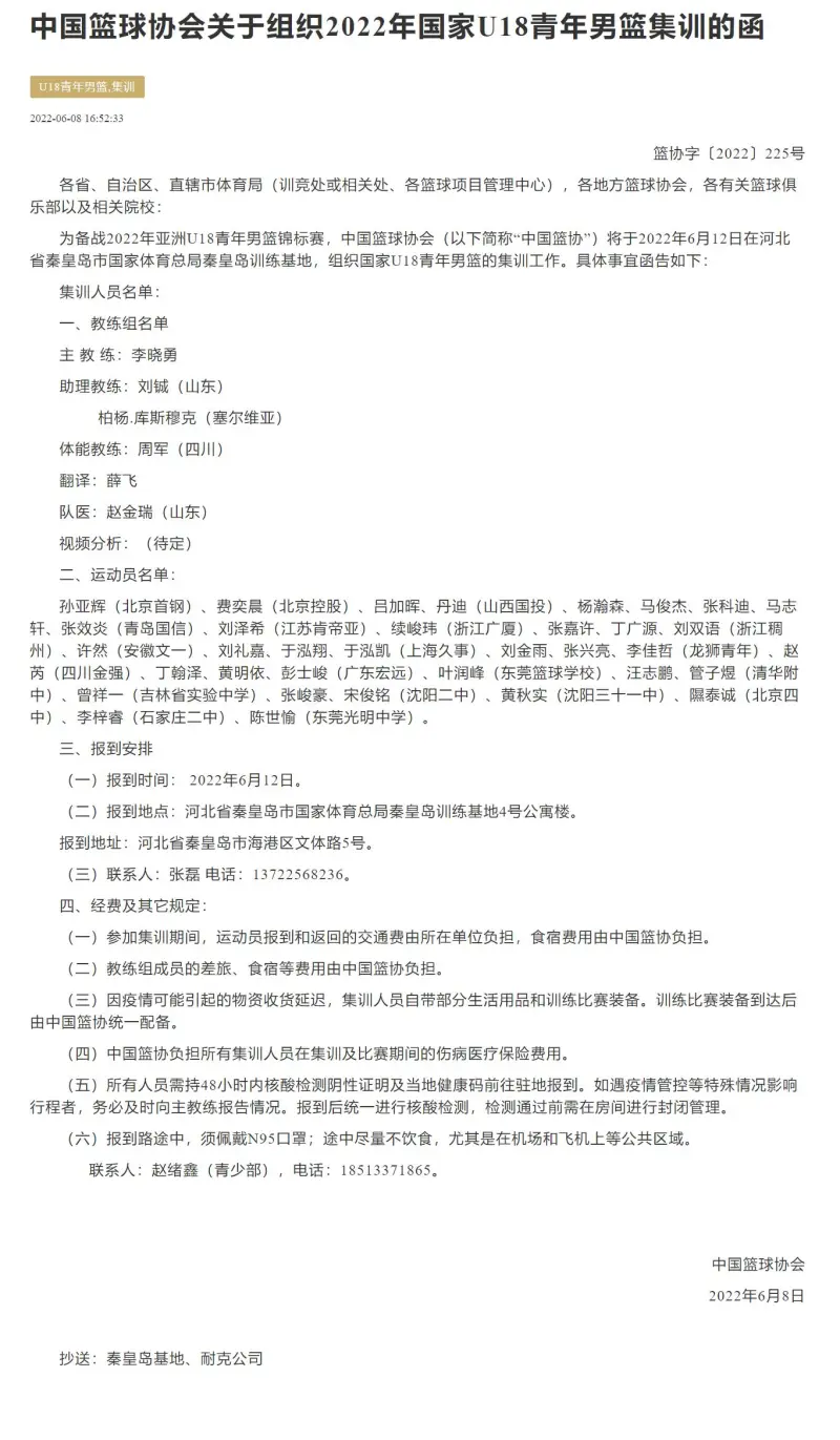 为备战2022年亚洲U18青年男篮锦标赛,中国篮球协会(以下简称“中国篮协”)将于2022年6月12日在河北省秦皇岛市国家体育总局秦皇岛训练基地,组织国家U18青年男篮的集训工作。具体事宜函告如下: