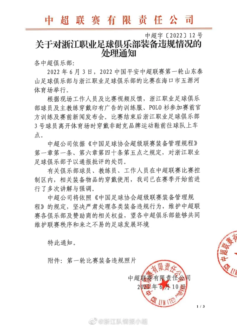06月12日讯 据博主“浙江队情报小组”的消息,近日,中超公司方面向浙江队发出了一份通告,表示由于浙江队穿戴印有广告的训练服,从而进行通报批评。