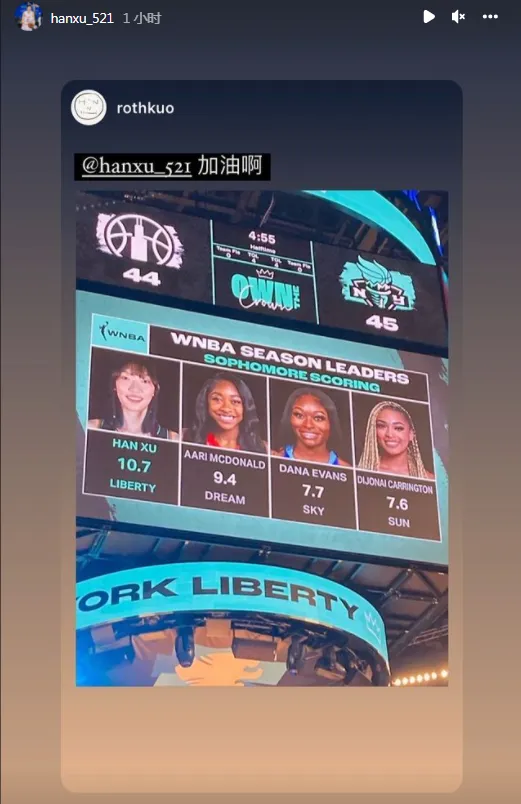 韩旭本赛季为WNBA纽约自由人出战11场,场均登场18.6分钟得到10.7分4.7篮板1盖帽。这是韩旭在WNBA的第二个赛季,她也是WNBA本赛季得分最高的二年级球员。