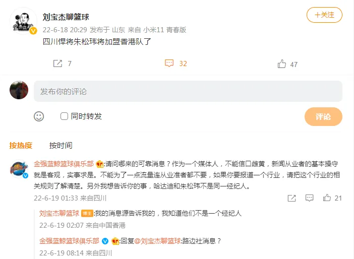 “请问哪来的可靠消息?作为一个媒体人,不能信口雌黄,新闻从业者的基本操守就是客观,实事求是。不能为了一点流量连从业准者都不要,如果你要报道一个行业,请把这个行业的相关规则了解清楚。另外我想告诉你的事,哈达迪和朱松玮不是同一经纪人。”四川男篮官方微博写道。