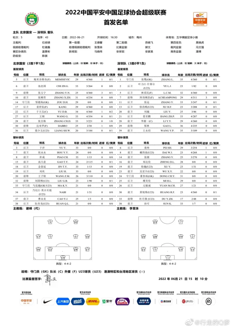 06月21日讯 北京时间6月21日下午16:30,中超第五轮,北京国安对阵深圳队。赛前,双方的首发名单已经公布。