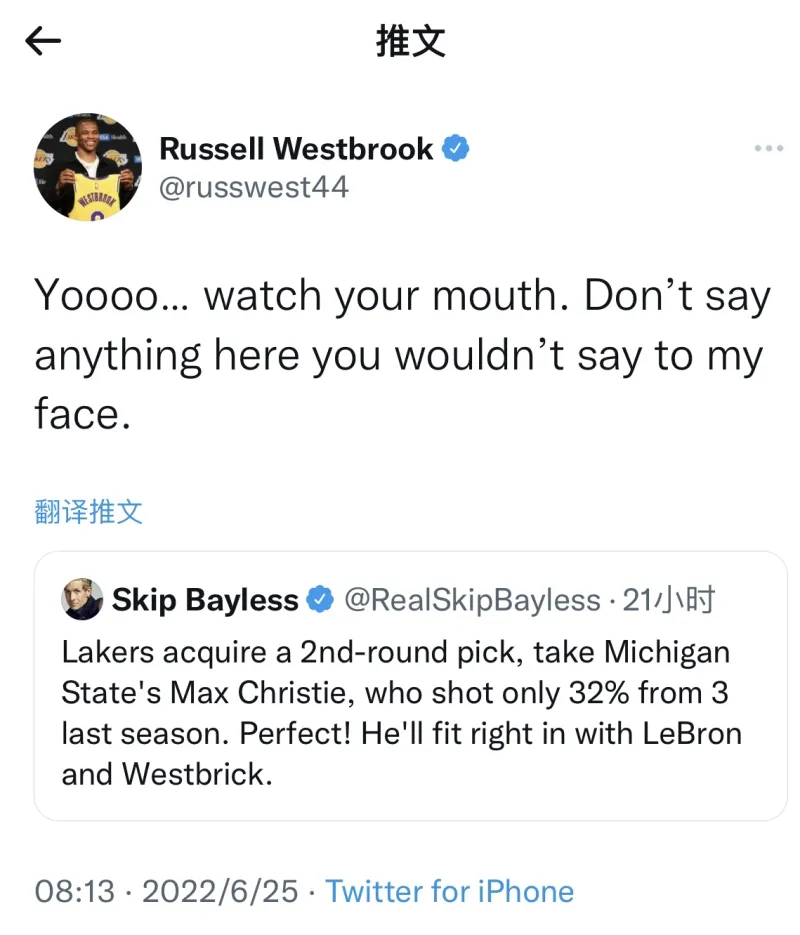 06月25日讯 湖人后卫拉塞尔-威斯布鲁克今日发推回应批评。
