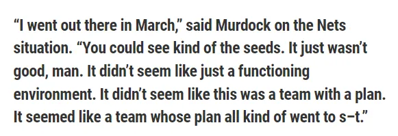 “我在三月份去过那里(指篮网团队),”默多克谈到篮网的情况时说,“在那时你就仿佛能看到某种种子,感觉那是不好的种子在生根发芽。感觉那里似乎不像是是一个正常运行的环境。这看上去根本不是一支有计划的团队,而是一支计划全部一败涂地的团队。”
