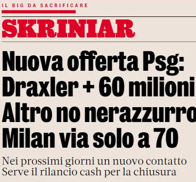 06月27日讯 来自《米兰体育报》国米跟队记者Vicenzo D'Angelo的报道,巴黎圣日耳曼为国米中卫什克里尼亚开出了6000万欧元+德拉克斯勒的最新报价,不过再次遭到了国米的拒绝,蓝黑军团只想要7000万欧元以上的现金。