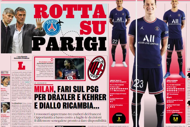 06月28日讯 来自《米兰体育报》米兰区负责人Luca Bianchin和驻巴黎记者Alessandro Grandesso的联合报道,米兰看中了迪亚洛、德拉克斯勒三位巴黎圣日耳曼弃将(原文使用了esuberi一词 ),并考虑抓住这些低成本的转会机会。