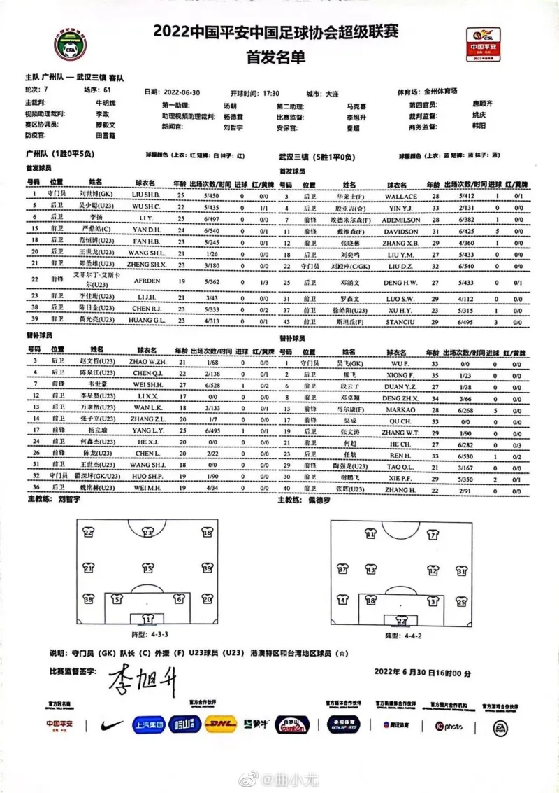 06月30日讯 6月30日讯 2022赛季中超第七轮广州队对战武汉三镇首发出炉。