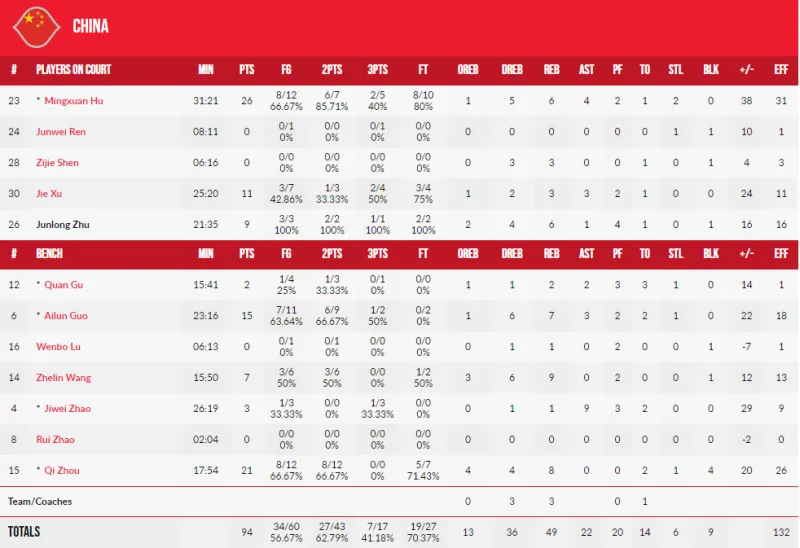 周琦21分8篮板4盖帽,胡明轩26分6篮板4助攻,郭艾伦15分7篮板3助攻,徐杰11分3篮板,朱俊龙9分6篮板,王哲林7分9篮板。