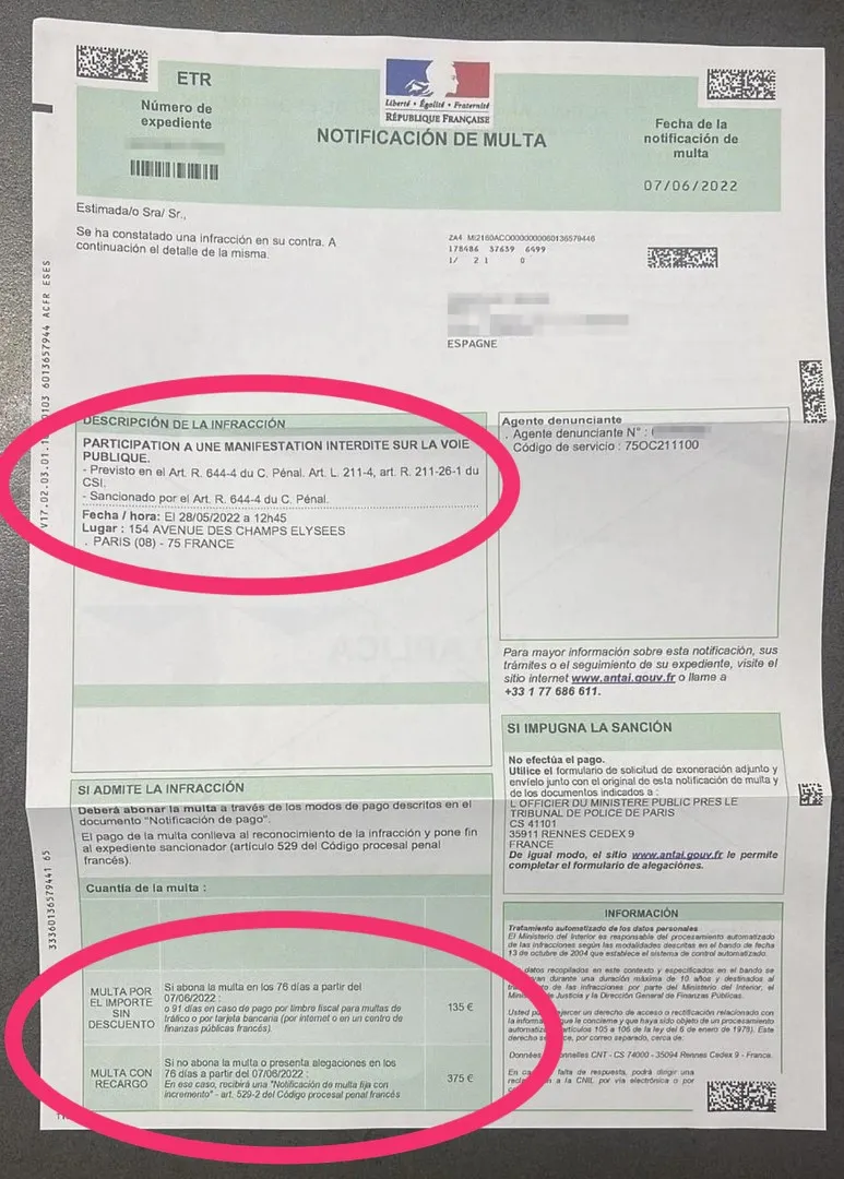 而在整整一个月之后,他们收到了来自法国警方的罚款传单,理由是“在共公开场合进行未经报备的非法示威”,需要支付135欧元。如果逾期,罚款将上涨到375欧元。
