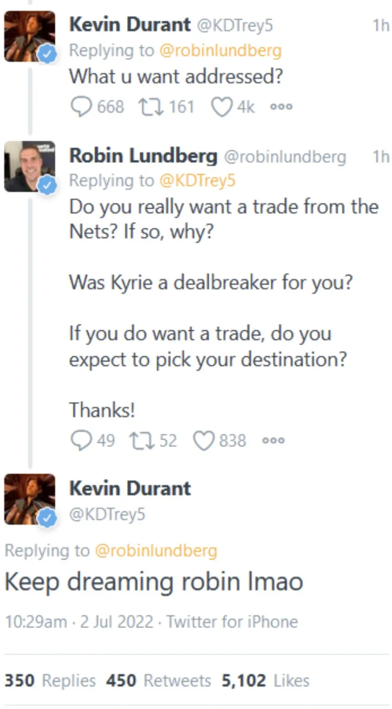随后杜兰特又在这条推特下面与《体育画报》节目主持人兼记者Robin Lundberg进行了互评。