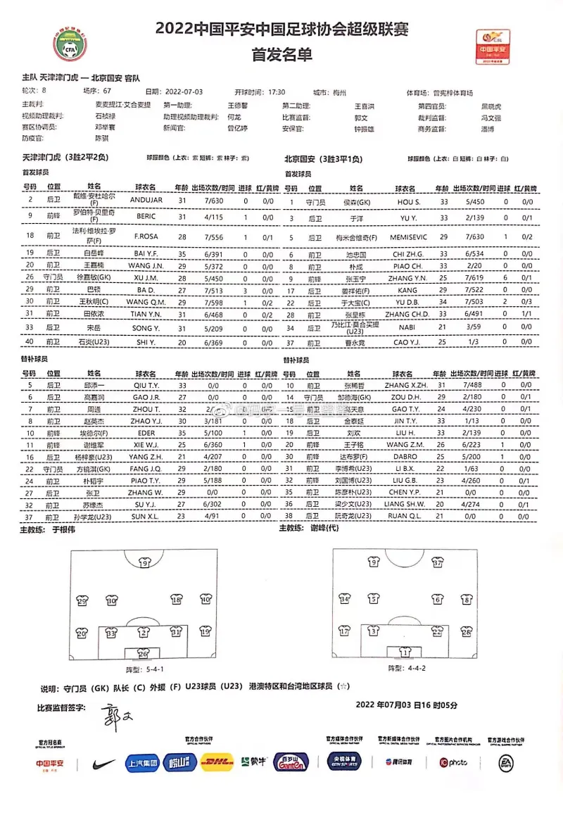 07月03日讯 中超联赛第一阶段第八轮,京津德比将于17:30分打响。赛前,双方公布了首发阵容。
