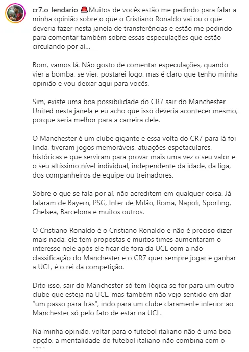 07月03日讯 C罗著名球迷账号,Factos梗的“始发地”,Instagram账号cr7.o_lendario在ins上发文,他从他的角度对C罗的未来进行了一番剖析。