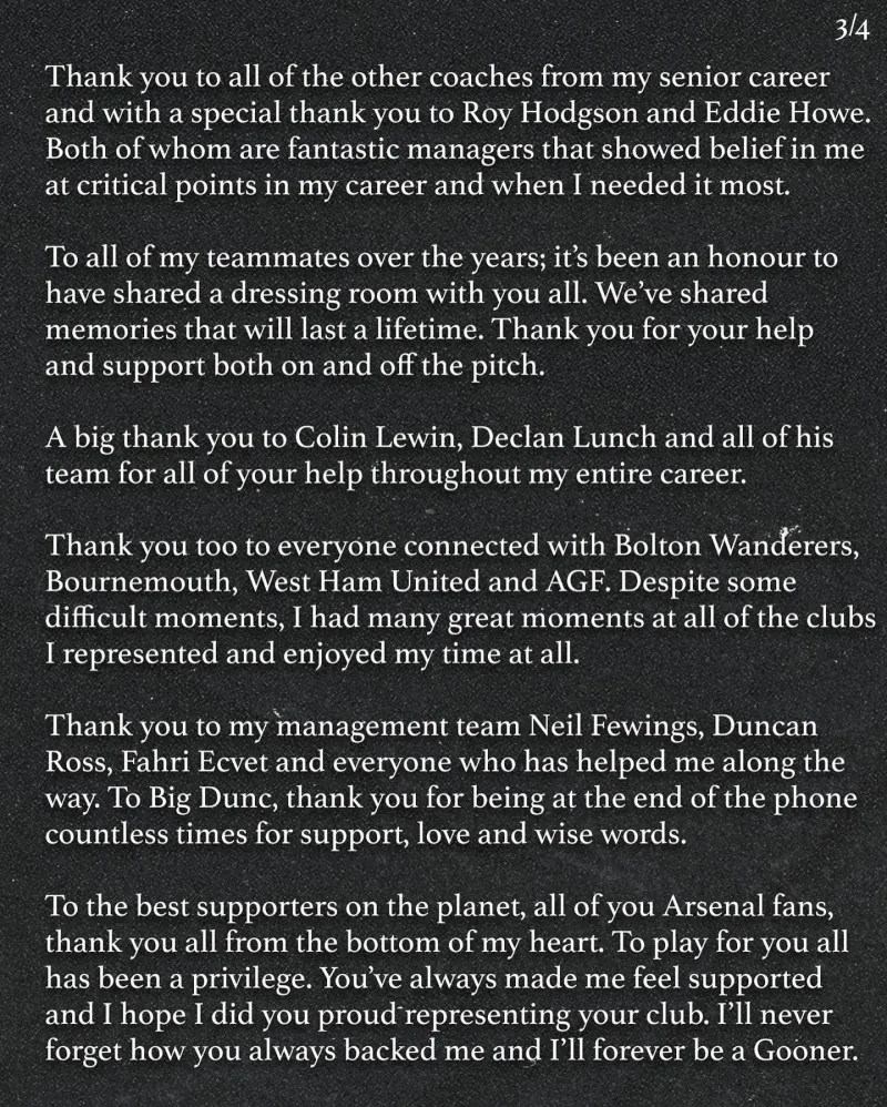 威尔希尔在长文中写到:“今天我宣布自己退役的决定,这是一段难以置信的旅程,从小男孩到阿森纳队长再到为国家队效力参加世界杯,我已经完成了我的梦想,谢谢一路上的所有人。”