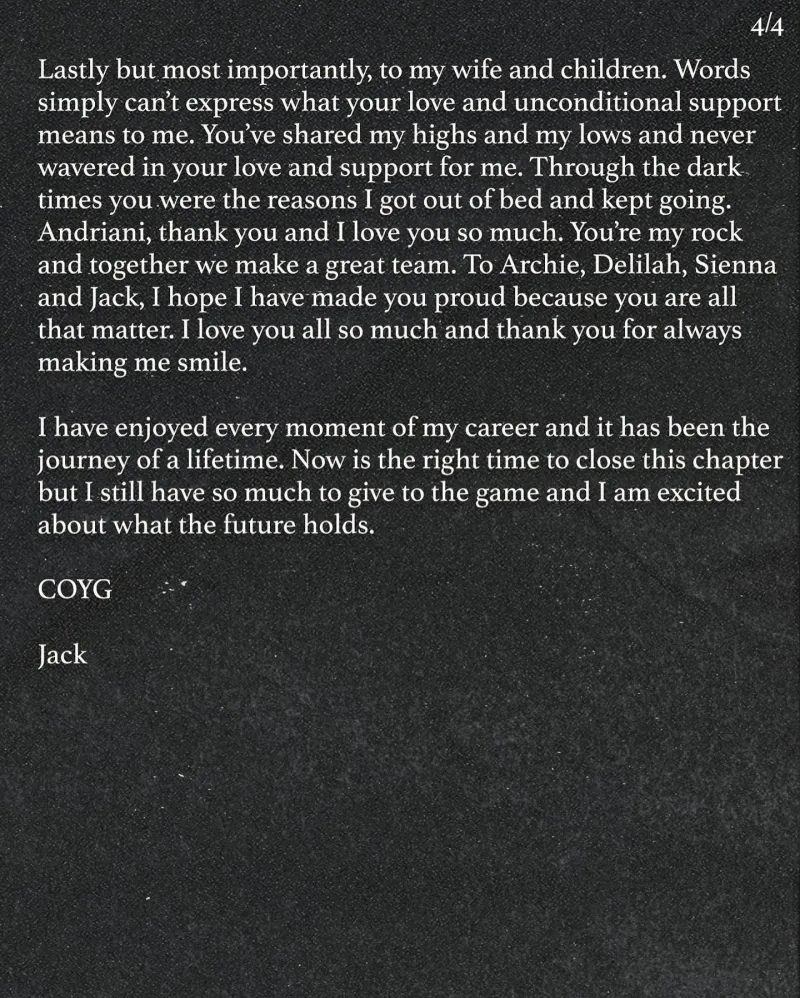 我很难接受最近我的职业生涯因为一些我无法控制的原因而下滑,我觉得我还有很多东西可以奉献。在踢过最高水平的比赛后,我总是对比赛抱有巨大的期望,说实话我从来没有想过自己会处于目前这个情况。我花了时间去思考,并和与我最亲密的人沟通,我知道现在是正确的时间,尽管这是困难的时刻。我回顾自己的职业生涯,对我所取得的成就感到非常自豪。当我还是一个小男孩的时候,我和世界上最好的球员一起踢最高水平的比赛,赢得足总杯,成为俱乐部的队长,代表英格兰,这些都超出了我的预期。