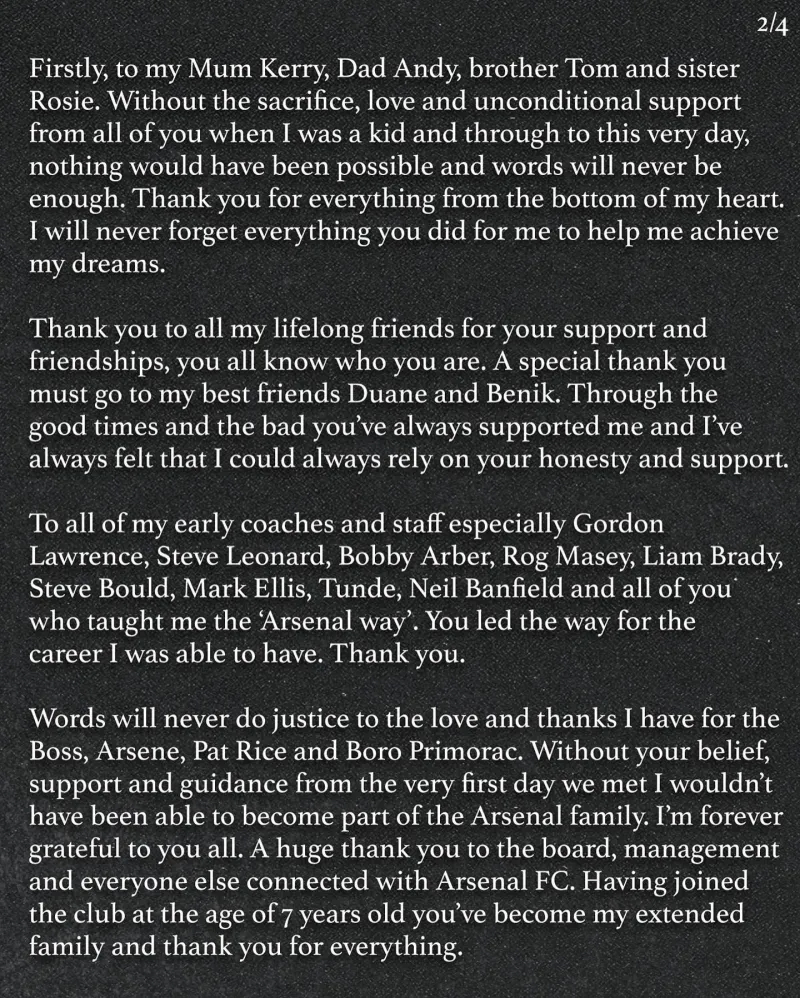 今天我宣布自己决定退役的决定,这是一段难以置信的旅程,一路走来充满了许多难以置信的时刻,我对职业生涯中所做的一切感到非常荣幸。从一个在花园里踢球的小男孩,到成为阿森纳的队长,再到为国家队效力参加世界杯,我已经完成了我的梦想。