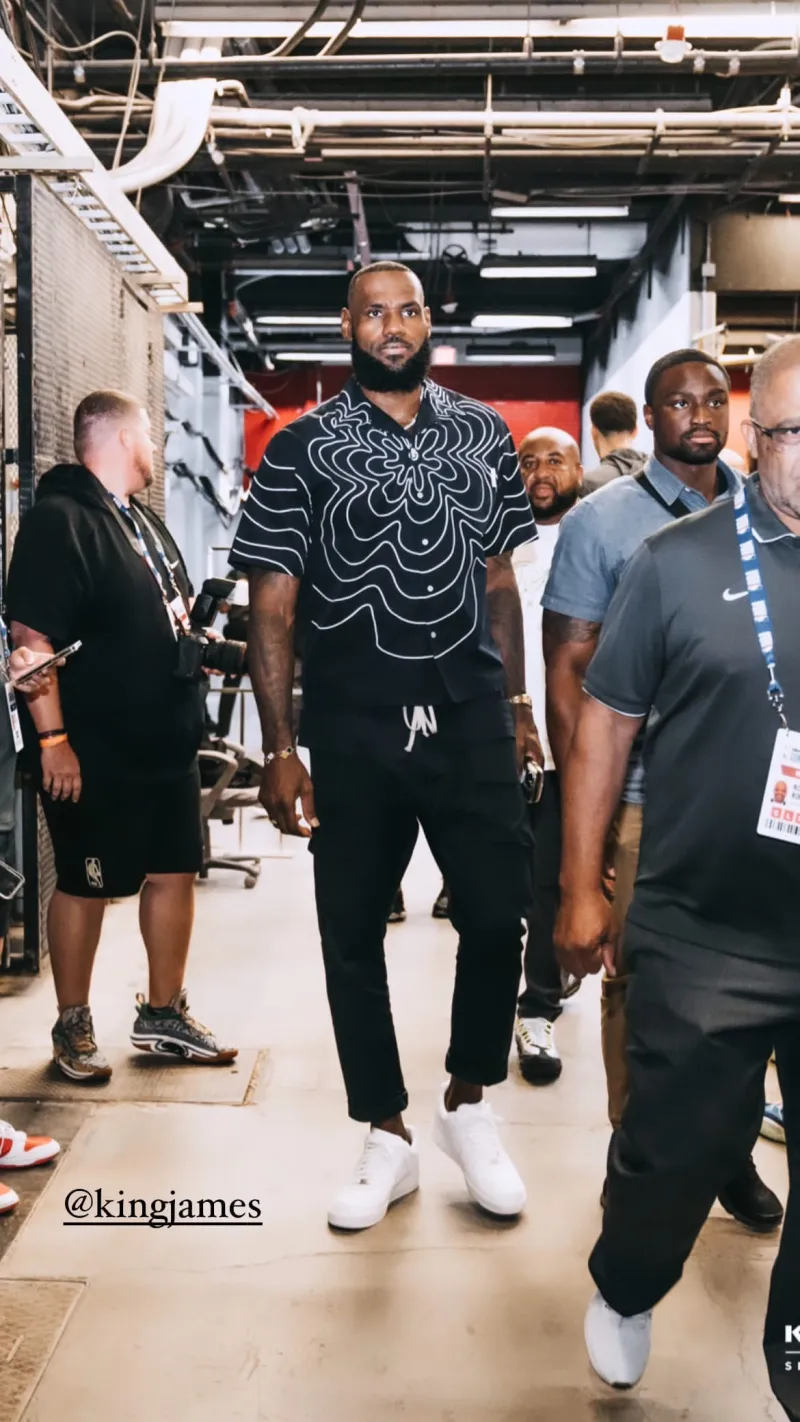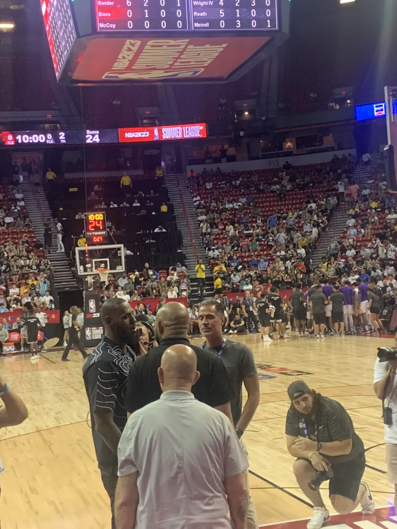 在第一节和第二节之间,湖人主帅达尔文-哈姆和湖人篮球运营副总裁兼总经理罗勃-佩林卡从他们在中场附近的座位上起身,走过去迎接詹姆斯的到来。佩林卡和詹姆斯简短地聊了一会儿,并用手捂住嘴以示谨慎。