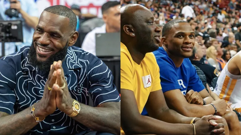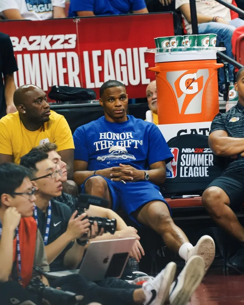 湖人的夏季联赛阵容可能在球场上对阵太阳,但所有的目光都在托马斯-麦克球馆的场边,詹姆斯和威斯布鲁克之间的距离没法更远了。