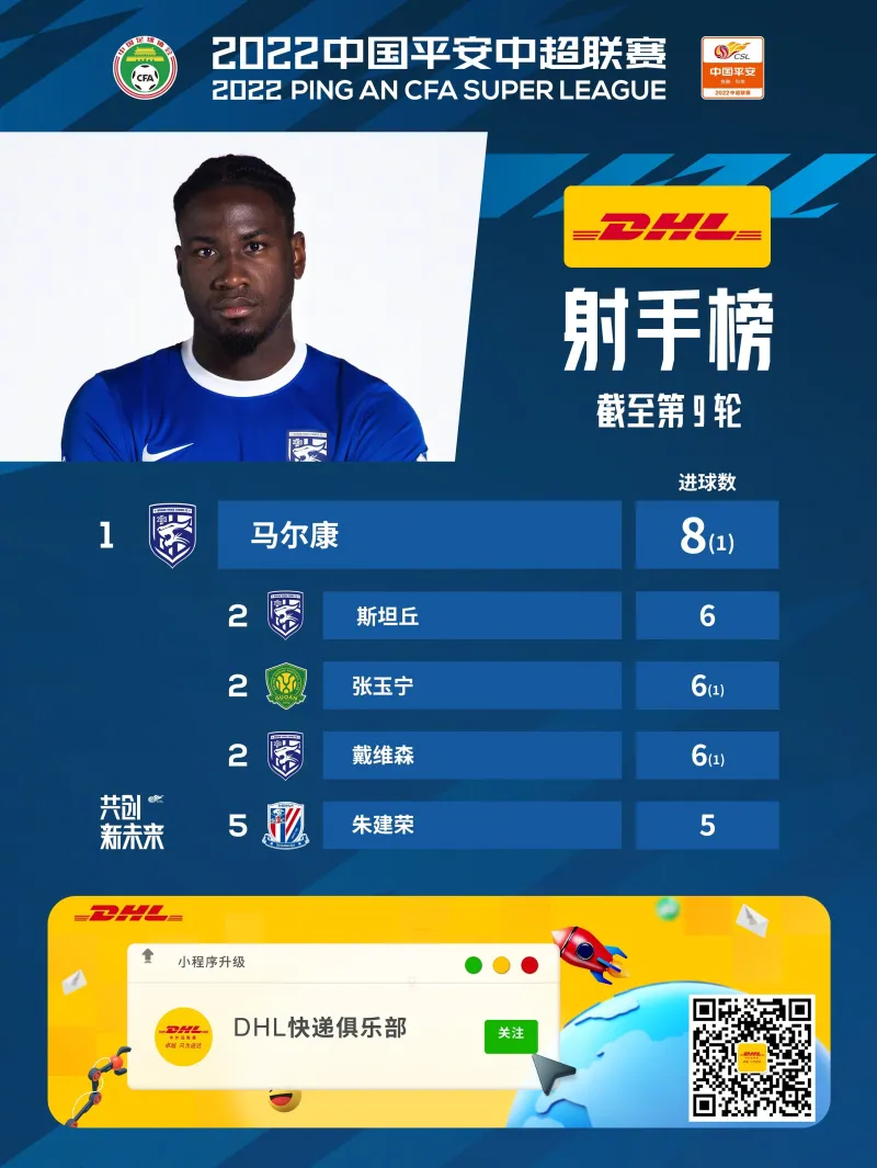 07月10日讯 中超官方公布了第9轮过后的射手榜排名,武汉三镇队三外援包揽皆上榜,马尔康8球领跑,斯坦丘和戴维森均打进6球,同北京国安的张玉宁并列射手榜第二。