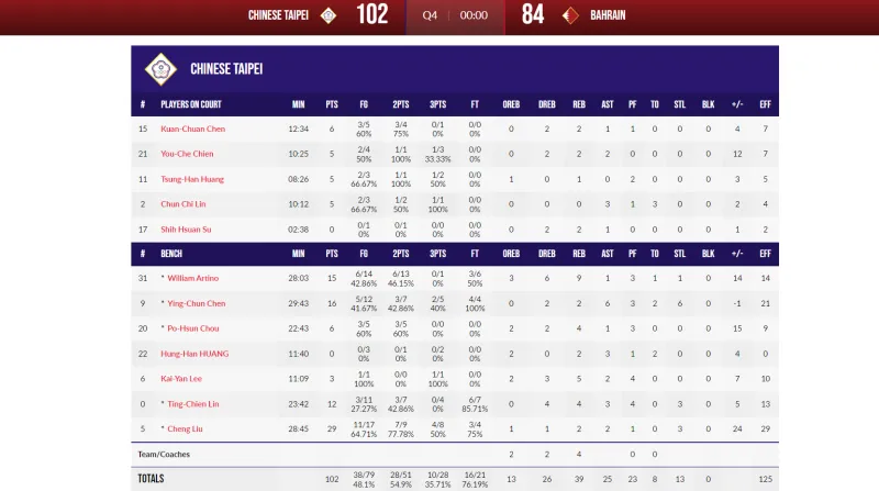 其中刘铮得到29分2篮板2助攻,陈盈骏得到16分6助攻2篮板,林庭谦得到12分4篮板3助攻,归化球员阿提诺得到15分9篮板1助攻。