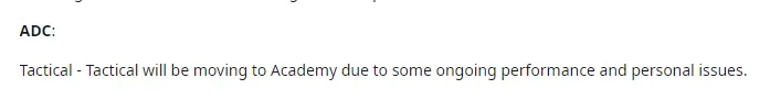 Tactical:由于一些持续出现的表现以及个人问题,Tactical将被下放到二队。