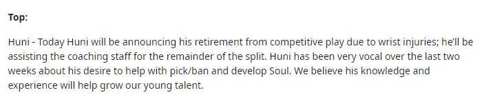 1、原TSM上单Huni选择退役并加入教练组。同时二队上单Soul升入一队