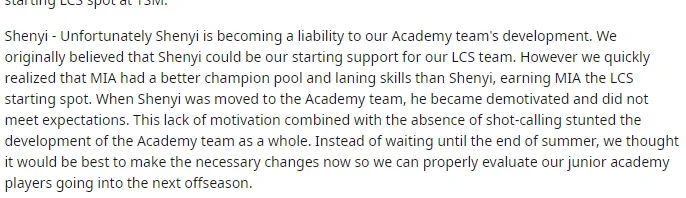Shenyi:很不幸,Shenyi正在成为学院队(二队)发展的累赘。我们本来认为Shenyi可以胜任一队的首发辅助。但我们很快发现,Mia的英雄池和对线能力都比Shenyi更好,因此Mia成为了一队的首发辅助。而随着Shenyi下放到二队,他变得失去动力,也没有达到我们的预期。他缺乏动力和指挥能力不足的问题已经阻碍了整个学院队的发展。与其等到夏季赛结束,我们觉得不如现在就做出改变。这样我们才能正确的评估下个赛季究竟要让那些选手进入我们的青训队。