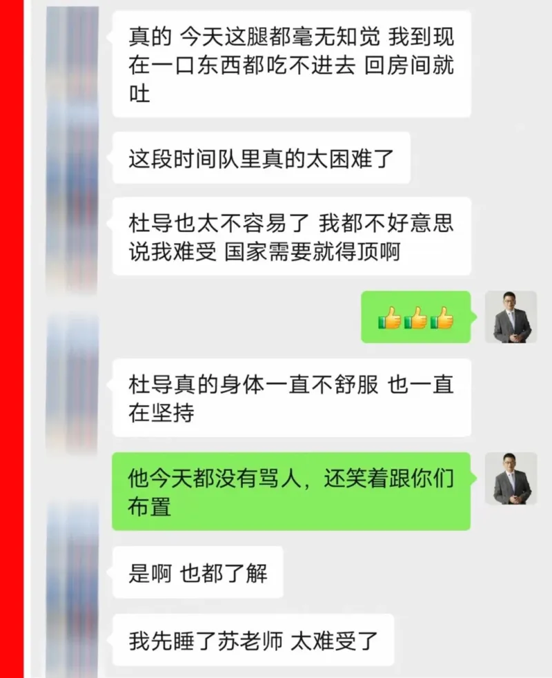 贺希宁表示:“真的,今天这腿毫无知觉,我现在一口东西都吃不进去,回房间就吐。这段时间队里真的太困难了。杜导也太不容易了,我都不好意思说我难受,国家需要就得顶啊。杜导真的身体一直不舒服,也一直在坚持。”
