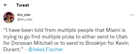 Jake Fischer在他的播客中表示:“很多人告诉我,热火正尝试收集多个首轮选秀权,送到犹他换取他们的当家球星米切尔,或者送去布鲁克林换得杜兰特。”
