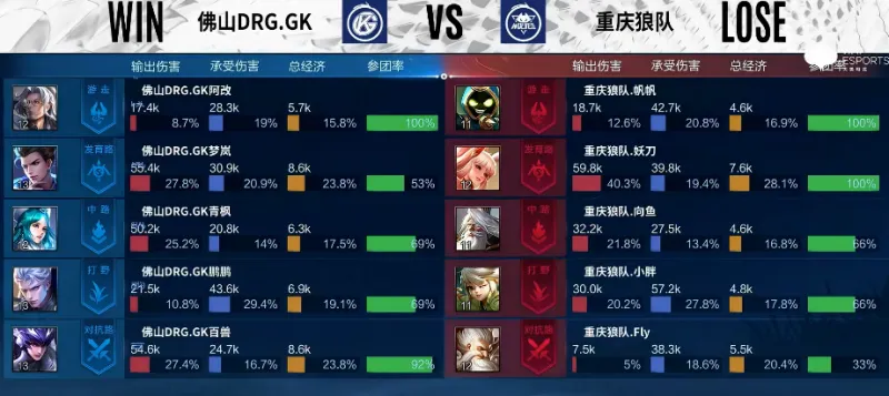 Game2:佛山DRG.GK蓝色方,重庆狼队红色方